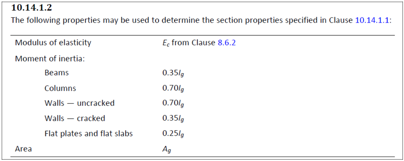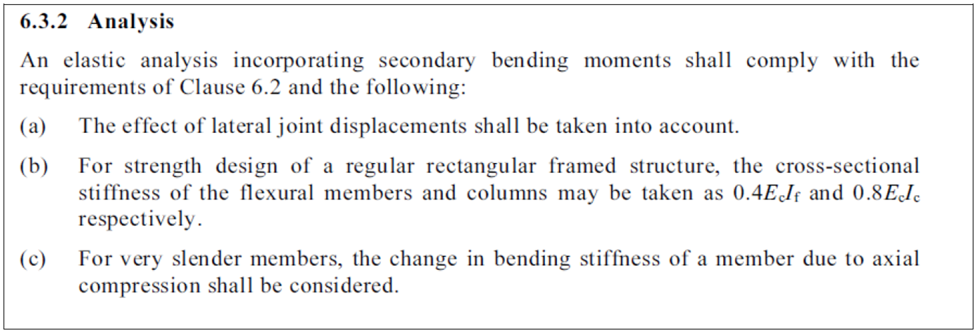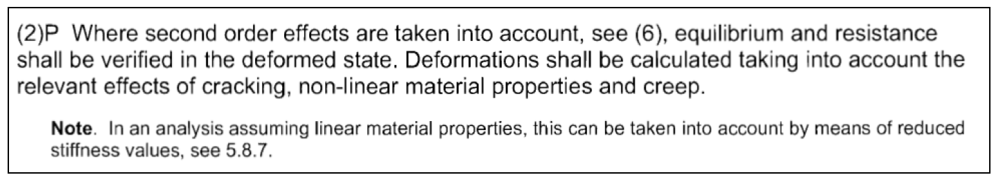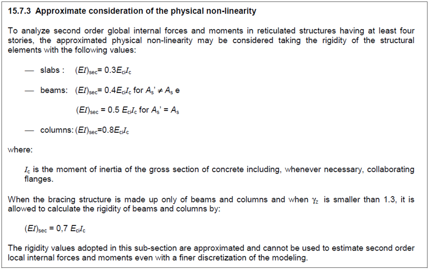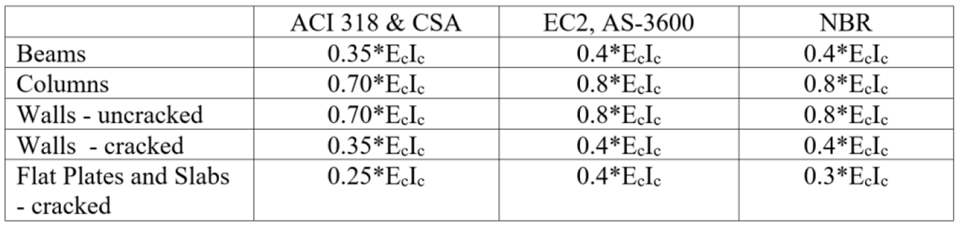In summary, based on the above, when performing global 2nd-order analysis based on ACI or EC2, NBR, AS-3600, it is permissible to account for material non-linearity (cracking, creep etc) using simplified stiffness reduction factors. The basic reduction factors for non-prestressed elements are as follows: