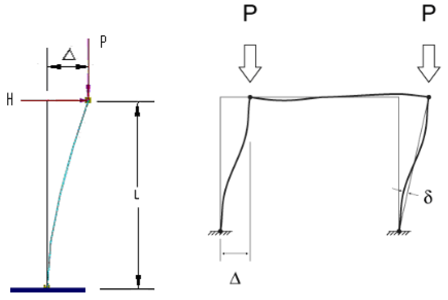 “Large” P-Delta (P-Δ) refers to the second order effect associated with the lateral translation of the members. The idea of large P-Delta (P-Δ) is illustrated in the following image.