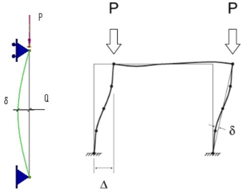 “Small” P-delta (P-δ) refers to the second order effect associated with the member curvature. The idea of small P-delta (P-δ) is illustrated in the following image.