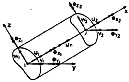 A standard 3-dimensional (Bernoulli-Euler) frame element is assumed, having the following local coordinate system: