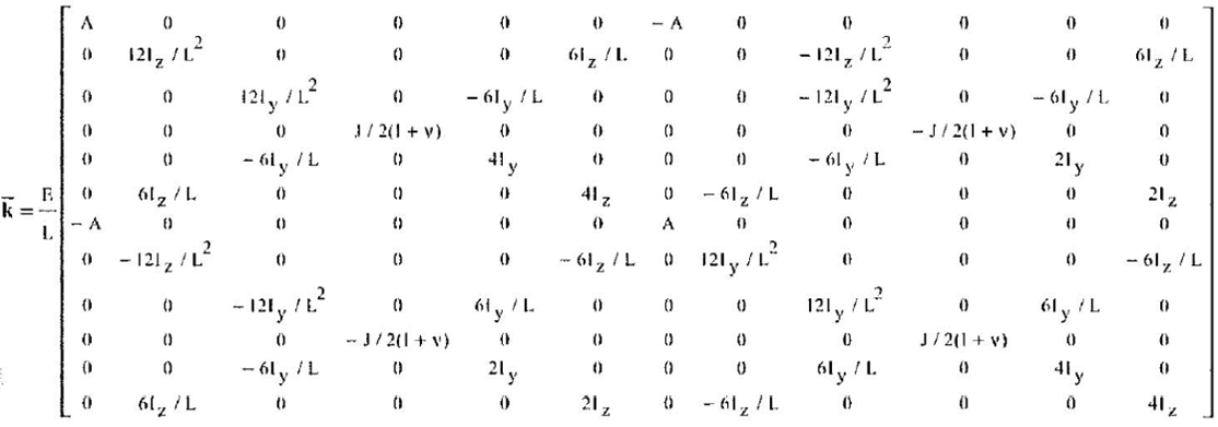 The elastic stiffness matrix of such a 3-dimensional frame element in the local coordinate system can be represented by the following 12x12 matrix:
