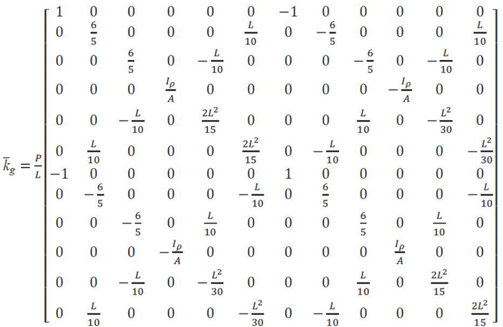 The corresponding geometric stiffness matrix of a 3-dimensional frame element in the local coordinate system can be represented by the following 12x12 matrix:
