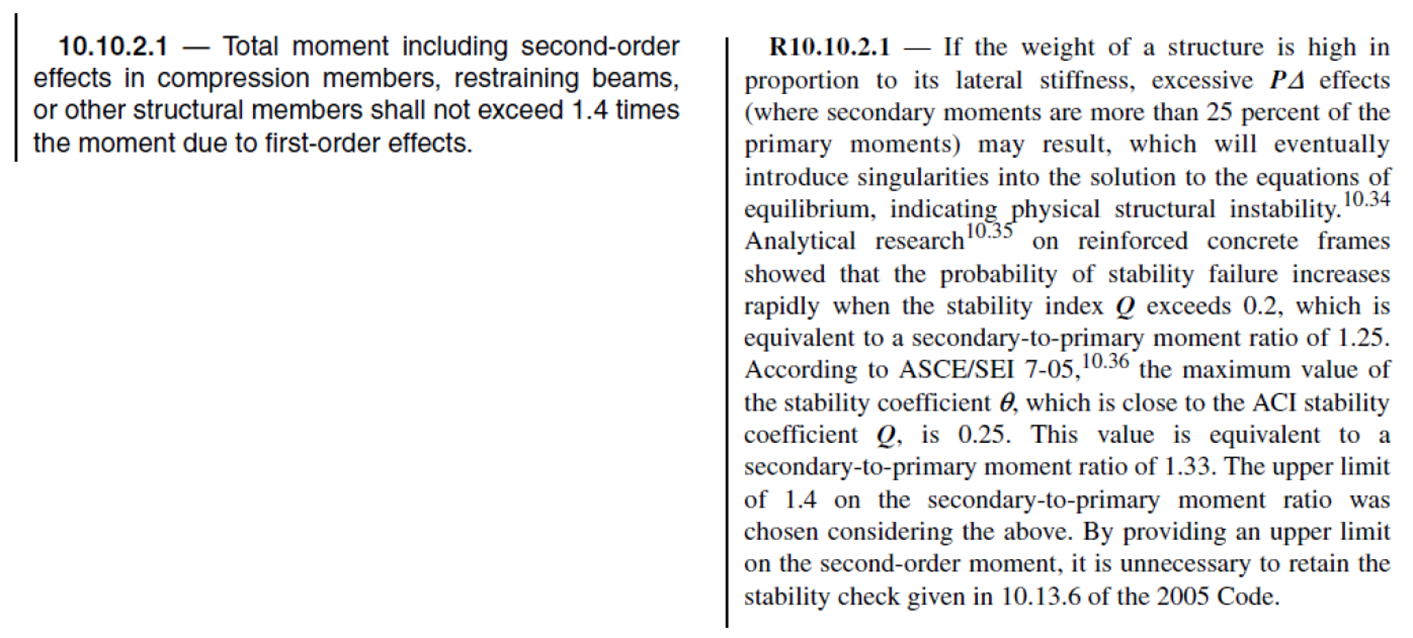 Starting from the 2008 edition of ACI 318 code, a unified stability requirement was introduced on compressive members (primarily columns) which limits the moment amplification due to P-Delta to 1.4 as a ratio of 2nd/1st order moments. This provision was presented in this edition of the code as follows: