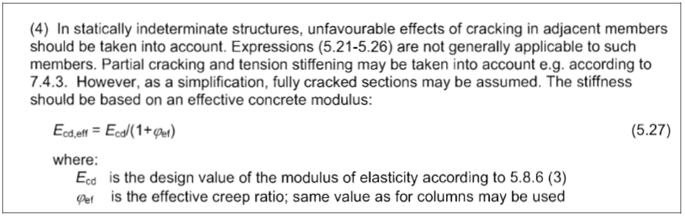The provisions of 5.8.7(4) are the most relevant from the standpoint of the implementation of P-Delta in ADAPT-Builder. This means that the stiffness reductions prescribed in eq. 5.27 (which are constant factors) are sufficient to satisfy the requirements of the EC2 code, for typical Multi-Story frame buildings. The value of effective creep ratio, ɸef, should be determined based on requirements of sections 3.1.4 and 5.8.4.