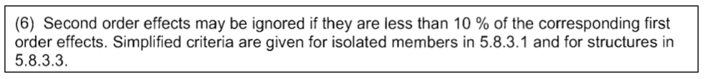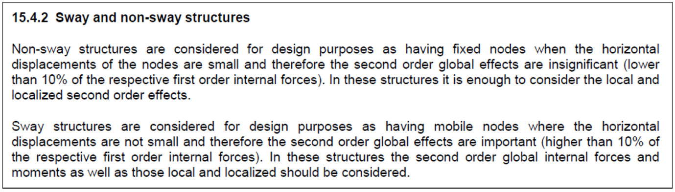 Essentially, this is a definition of a threshold between a non-sway and sway structure. The above limitation frees an engineer from more detailed slenderness design. The most adequate verification of this criterion can be obtained as a result of 2nd-order P-Delta analysis. In case the 10% limits for standard analysis are exceeded and second order analysis is needed, Eurocode 2 specifies the following general requirements: