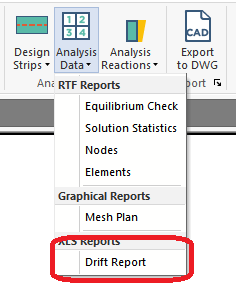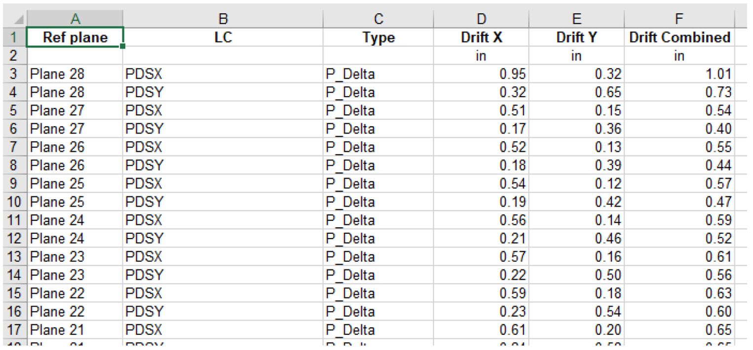 The program now includes the option to produce an XLS report with multiple data sheets for lateral drift results. These results can include or exclude P-Delta combinations or only 1st order lateral results.