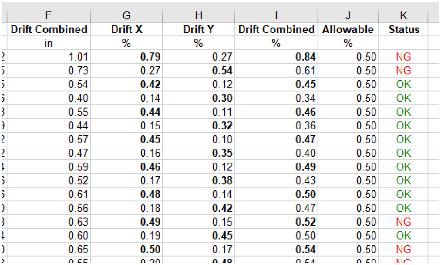 Additional results shown on this sheet are for code check against the maximum allowable drift %. The % drift for the selected directions are shown as well as the allowable %. If any of the direction values (X, Y or combined) exceed the allowable the program will flag this row (indicating a single column for a single load combination result) as NG. If the values are less than allowable the row will be flagged as OK. Note that for each plane and combination, the program will bold the text for those drift % values that exceed the allowable.