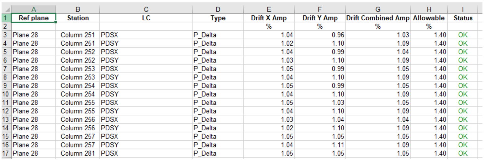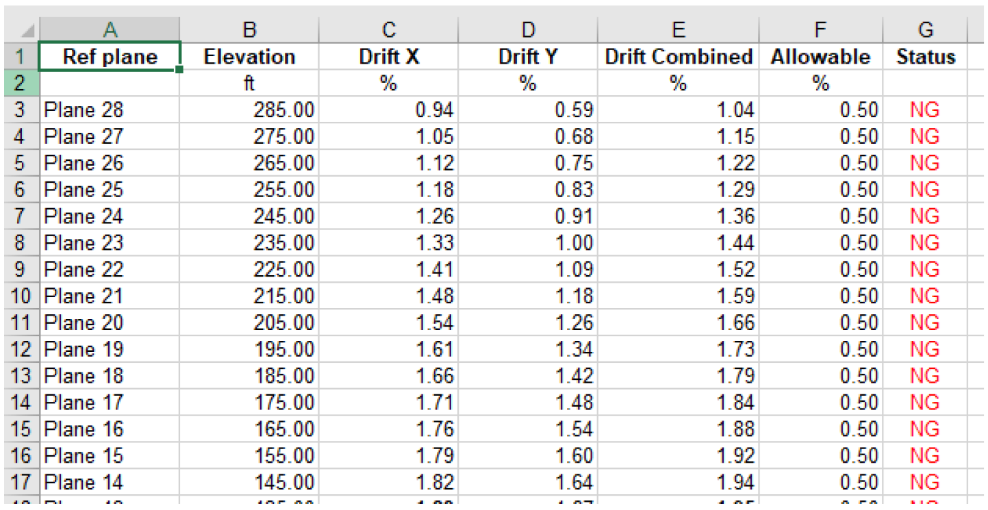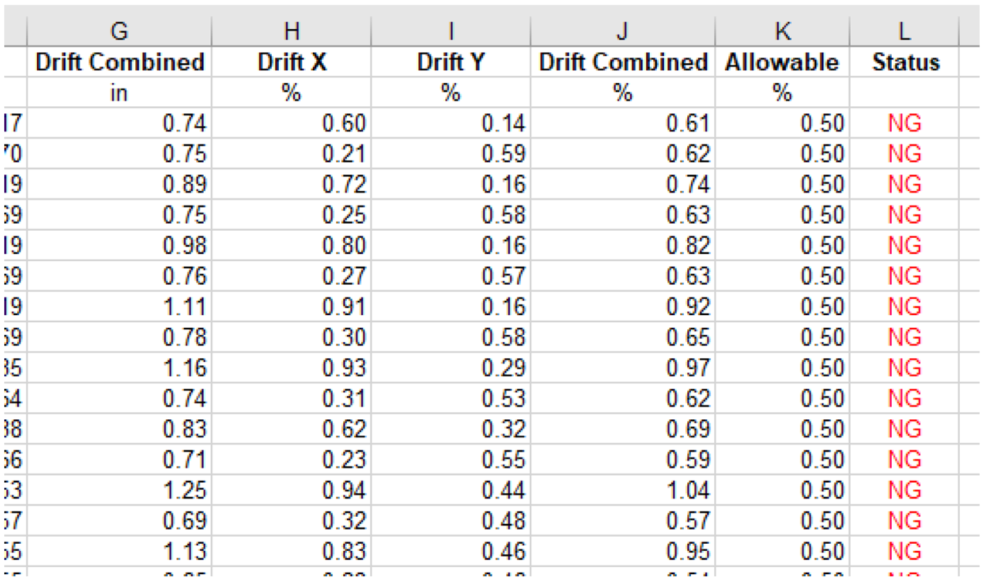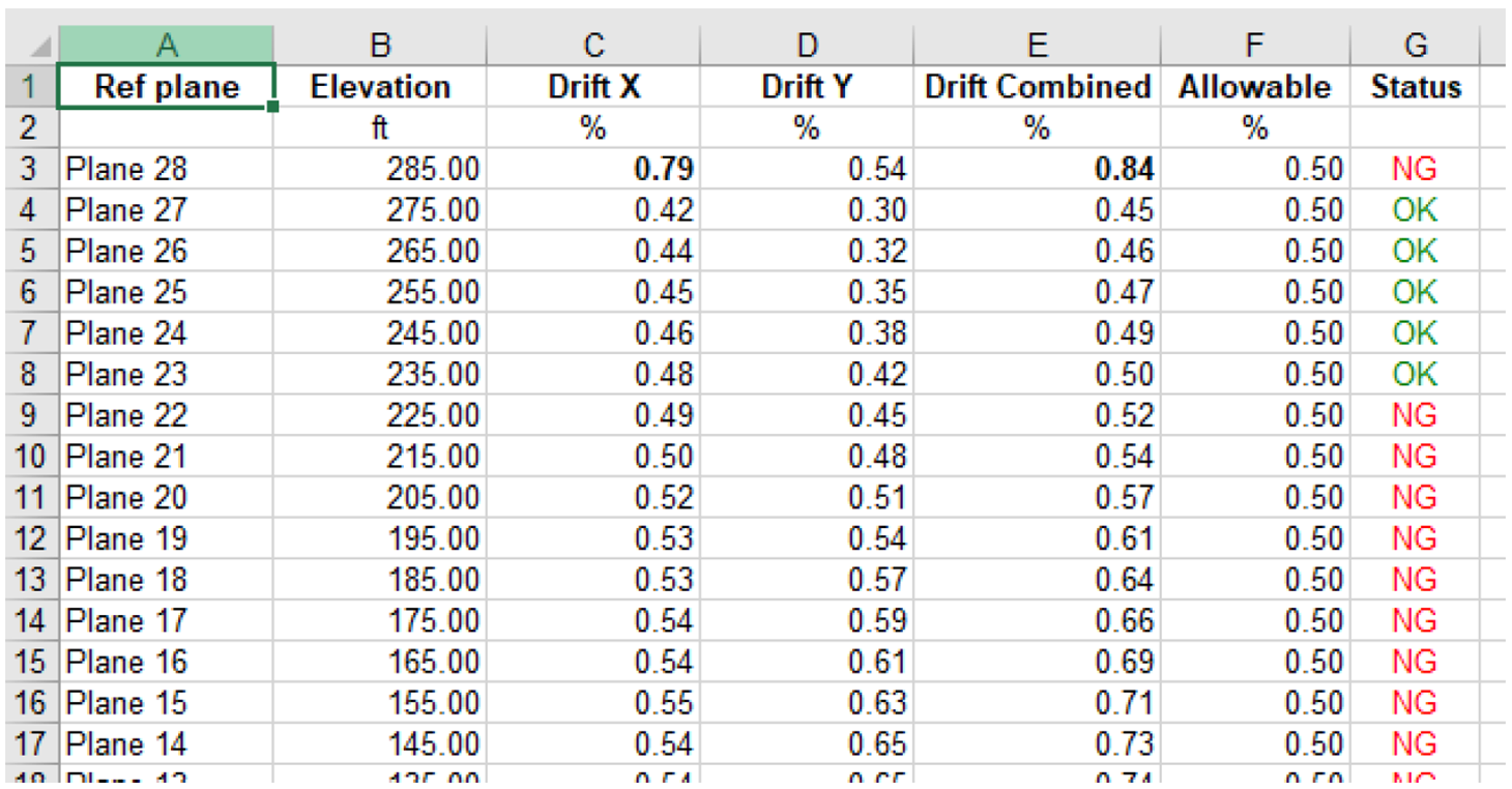 This sheet reports the maximum average drift % against the maximum allowable drift % for all combinations and all columns at a plane. The % drift for the selected directions are shown as well as the allowable %. If any of the direction values (X, Y or combined) exceed the allowable, the program will flag this row (indicating a single column for a single load combination result) as NG. If the values are less than allowable the row will be flagged as OK.