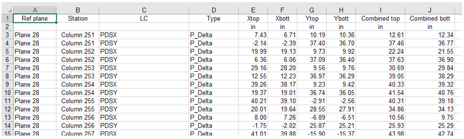 This report shows the inter-story drift values (in or mm) for each column, at each plane, for the selected combinations and directions. The combination analysis/design option type is listed.
