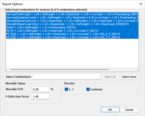 When you select the option to produce the drift report, the following dialog in the image below will appear, allowing you to customize the report. This dialog includes a list of design combinations for which a Multi-Level solution has been generated. You can custom-select which combination(s) to produce the report for.
