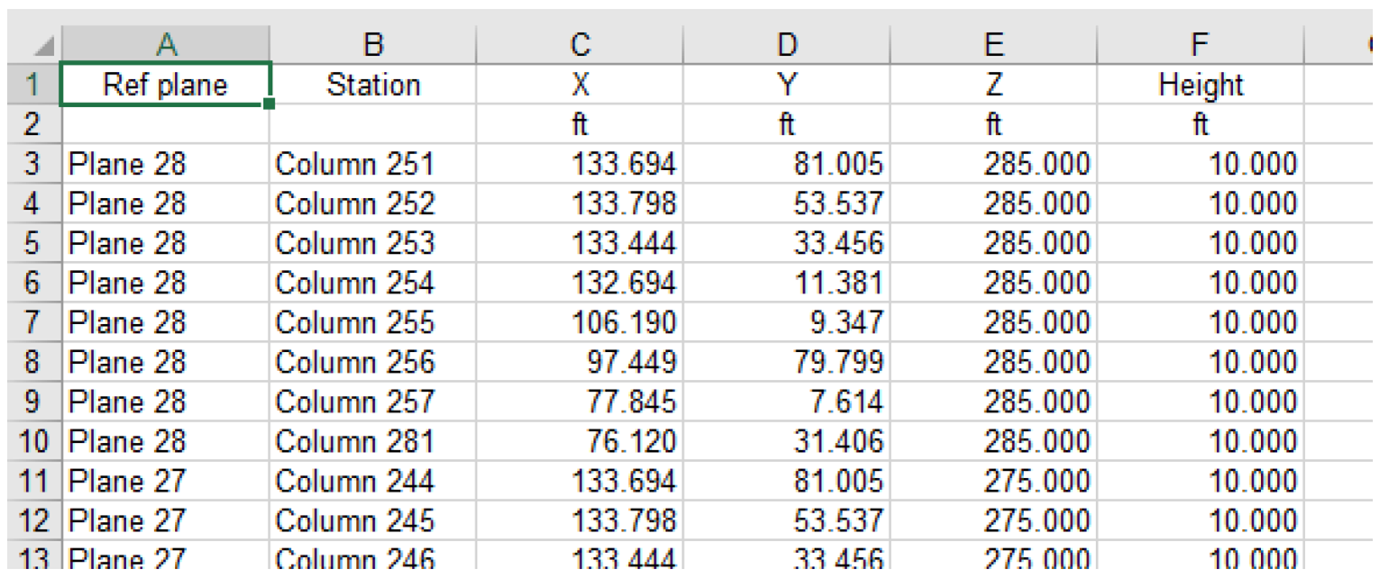 This report sheet lists all columns in the model starting at the upper-most plane and working down. The column label, global coordinates and height are shown.