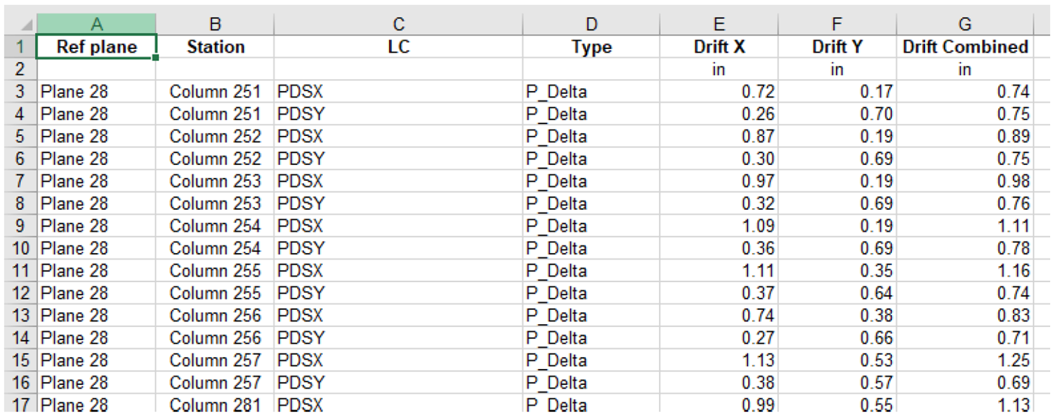 The XLS file will generate 7 unique sheets of data. These include Stations, Displacements, Drift at Columns, Average Drift, Max Drift Envelope, Average Drift Envelope, and Drift Amplification Factor. Each sheet is described briefly below with an illustrative example