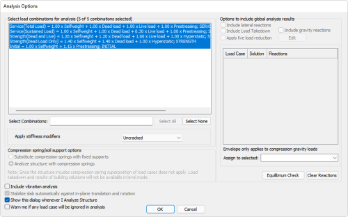 1. Select the options and load combinations you wish to include in the analysis run and click the OK button. The program will start the analysis process.