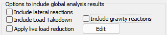 6. In the Options to include global analysis results panel on the right side of the Analysis Options window select to Include Lateral Reactions, and/or Load Takedown or Gravity reactions, and/or Live Load Reduction. If the option is inactive refer to the Analysis Options topic to learn how to make the option active so that it may be chosen.