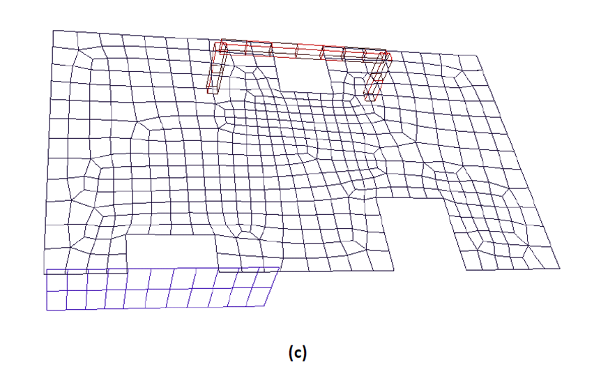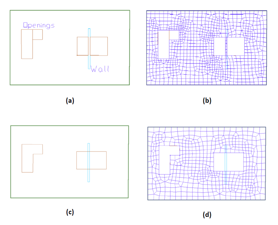When two or more openings are next to one another, such as the two openings at the left of the figure below, it is best to combine them into one opening as shown in part (c) of the figure. If left as is, an unnecessarily denser mesh can result (part (b) of the figure).