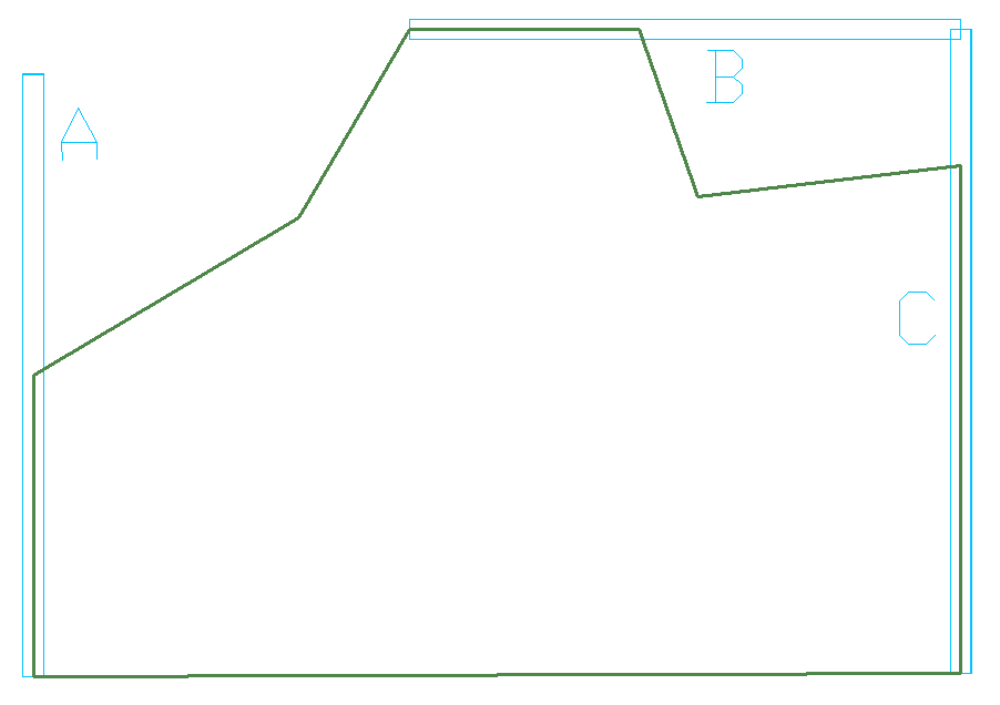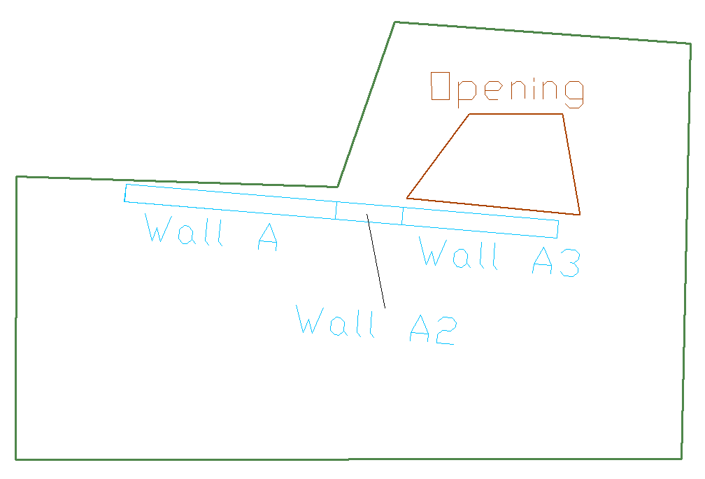 The image below shows a slab region with three walls A, B and C. Wall A does not intersect with another wall outside the slab area. This wall does not need special treatment. Walls B and C, however, intersect at a point outside the slab region. You must break each into two segments, one being the length within the slab region, and one outside it, as shown in the second image below. In other words, walls, or portions of walls, that fall outside a slab region should be modeled as a separate wall. This is a modeling requirement. From an analysis standpoint, the program will automatically consider the walls contiguous.
