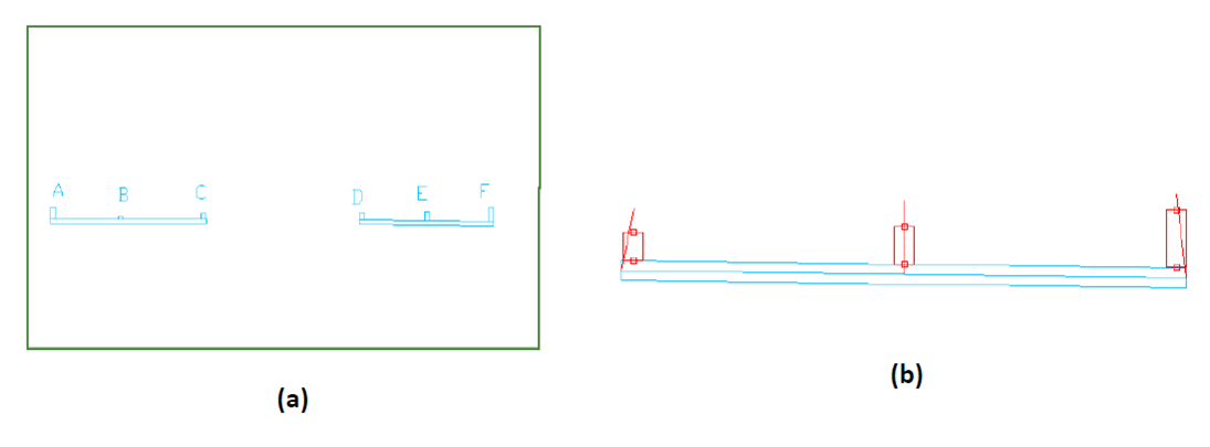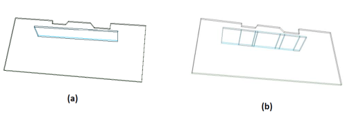 While not essential, where walls extend over more than one slab region, such as shown in the below image (b), you may break them into several walls for greater accuracy in your solutions. Break the wall, such that each sub-wall covers one of the slab regions. The wall in part (b) of the figure is continuous, but it is broken into three parts. When the Establish Component Connectivity tool of the program is invoked, the program automatically adjusts the top of each sub-wall to be in line with the soffit of respective slab region. The separation of the walls shown in part (b) of the figure does not affect the analysis of the structure. In the analysis, the walls that touch one another, such as the scenario in this case, will be considered contiguous and will be treated as one wall. There will be full compatibility of deformation among the sub-walls.
