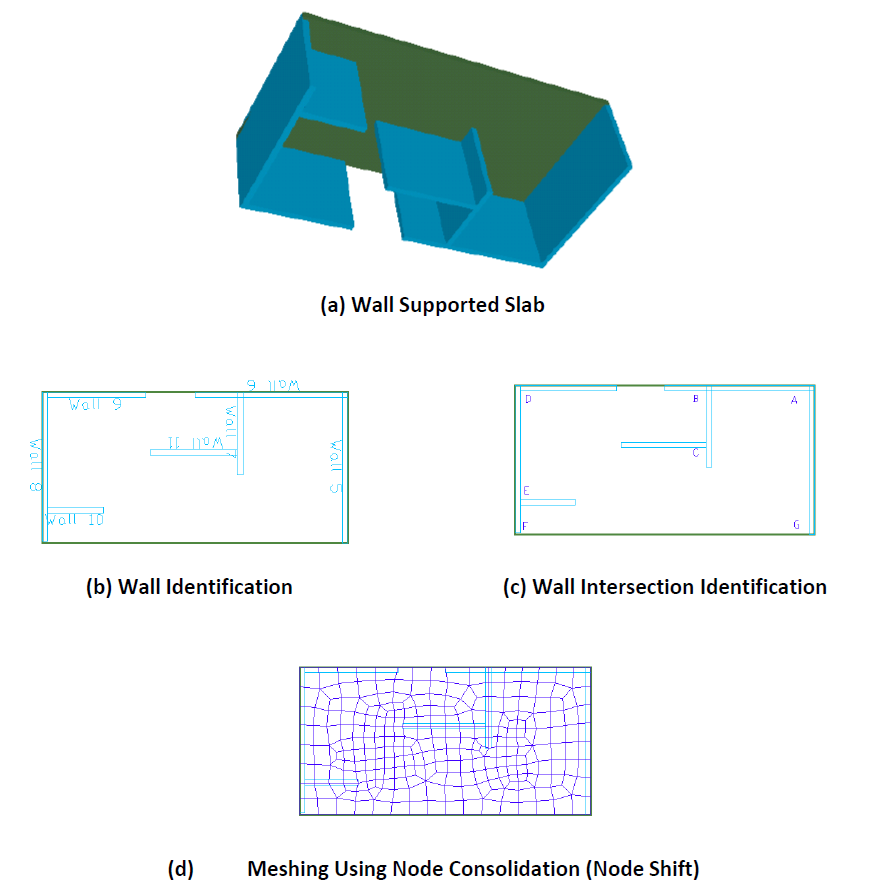 There are several options to model the intersection of walls. These are illustrated in the following image. At “A” (part (c) of the figure), the walls intersect (overlap). Likewise, at “B,” Wall 7 is modeled to overlap with Wall 6. Wall 9 butts to Wall 8 at intersection “D.” Using the node shift option, the resulting meshing is shown in part (c) of the figure. Note that in all instances the intersection is consolidated into a common node. The difference between the various modeling schemes lies in the meshing and design of the wall itself. For example, for calculation of building weight and wall design, the length of Wall 10 is calculated to the face of Wall 8. But the length of Wall 5 is calculated to the outside face of Wall 6. That is to say, Wall 5 is assumed to extend over the entire width of the slab.