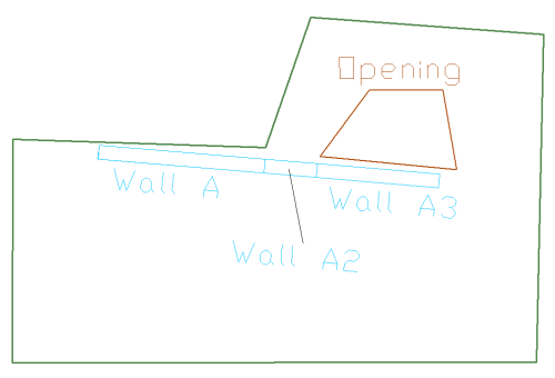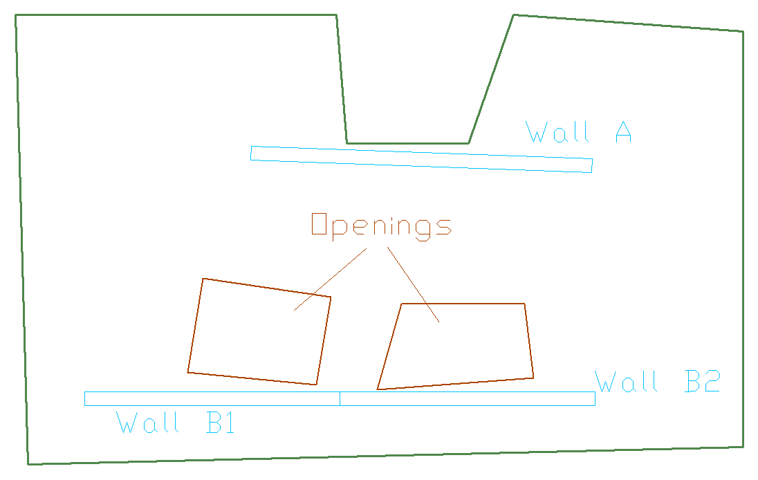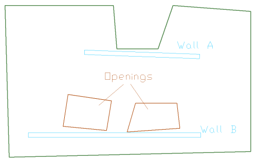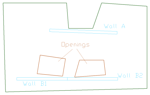 Consider wall A in the image below. This wall need not be subdivided regardless of whether or not shift node option is used, since its analysis axis can be shifted (lined up) to the slab edge next to it. Wall B adjacent to the two openings, however, must be broken down if shift node is used, since its axis cannot be simultaneously lined up with the edges of both of the openings. If node shift option is used, it is best to break up this wall into two segments.