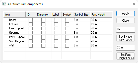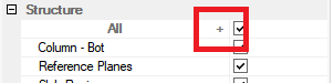 Check the boxes in the symbol column for the walls, columns, and beams as shown below.