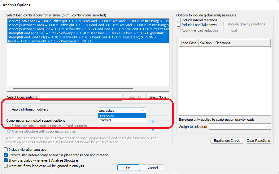 In the Analysis Options window select the Usage Case you want the solution to be based off of from theApply stiffness modifiers drop-down menu.
