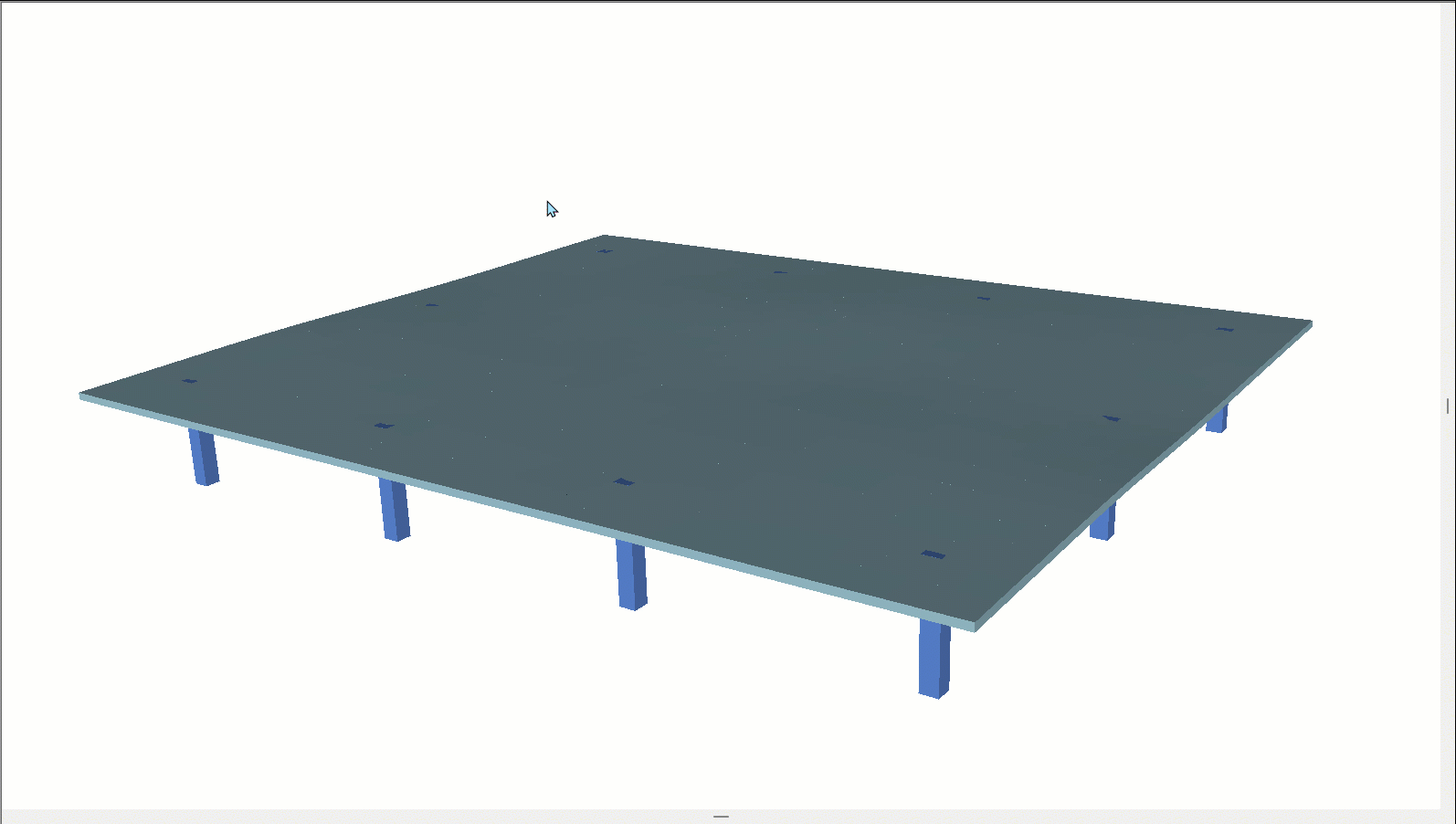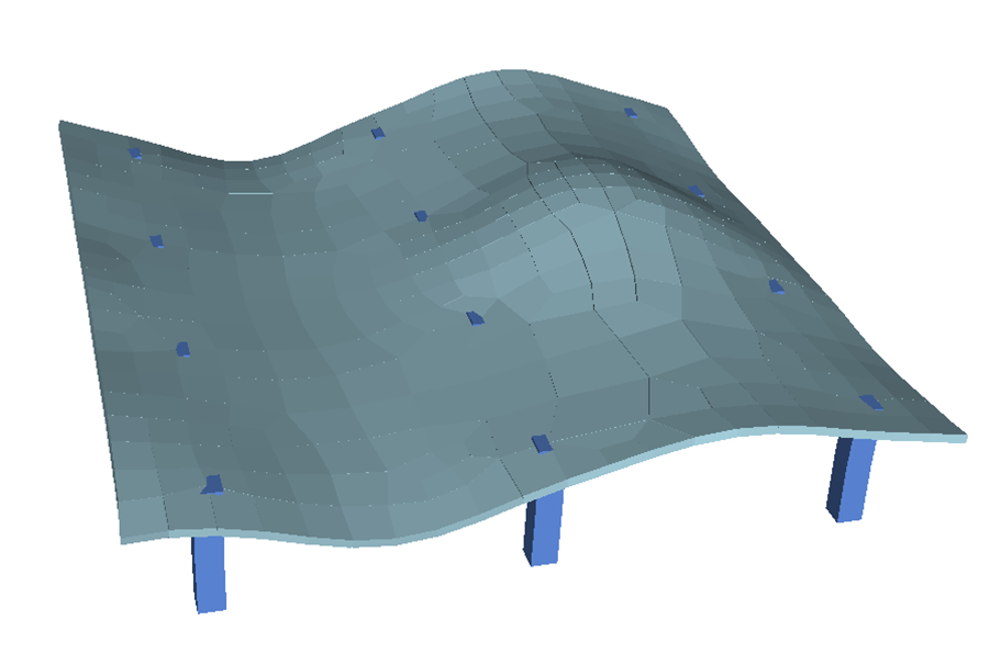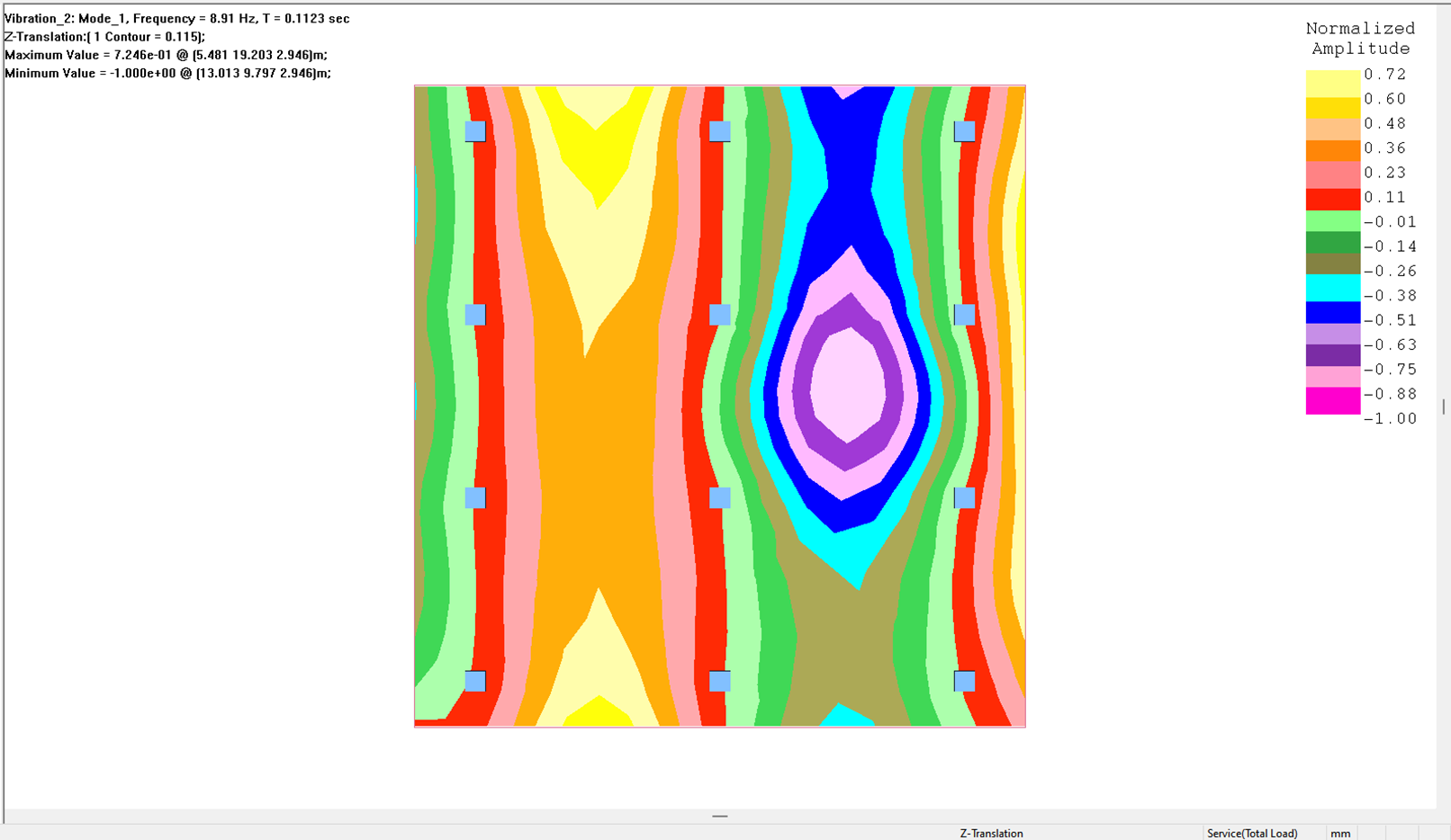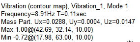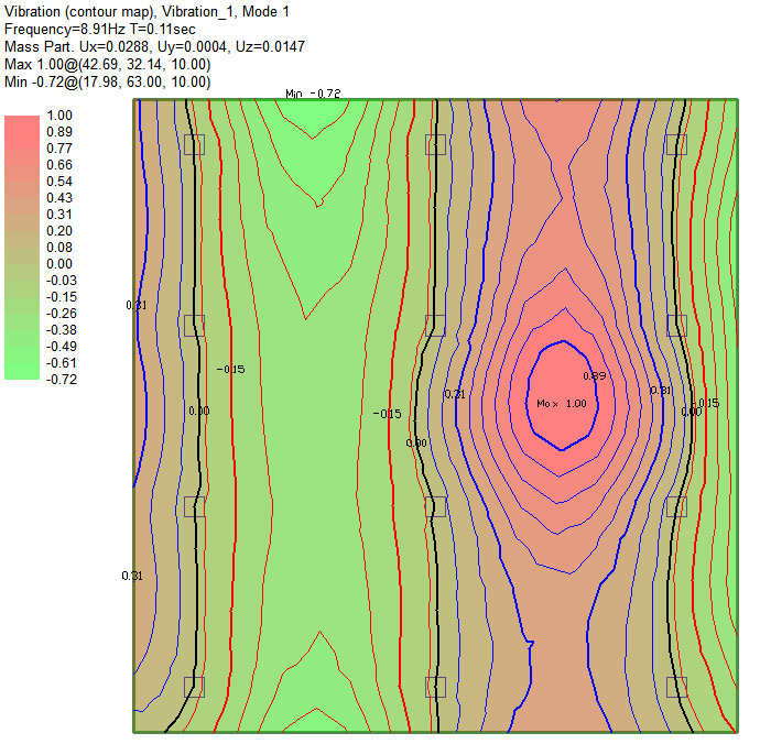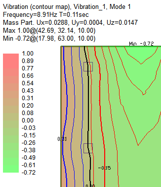 After an analysis has been completed for a given slab, you can view vibration results in either the ADViewer or the Results View panel. The program reports the frequency (Hz), period (sec) and shows a normalized amplitude scale at the right edge of the screen. The maximum and minimum values in reference to the amplitude scale are also reported. The Mass Participation factor can be viewed per mode from the Results View panel, or in the Mass Participation Factor dialog window for all modes.