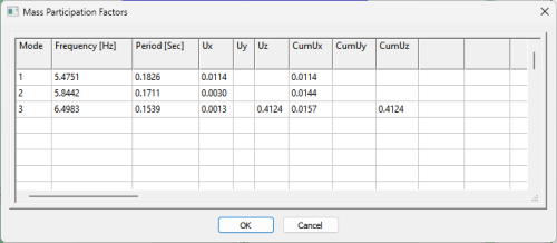 Users can view and copy this data from the Mass Participation Factors dialog window to their own spreadsheets. The Mass Participation Factors dialog window lists the Frequency, Period, and Mass Participation factors for each Mode.