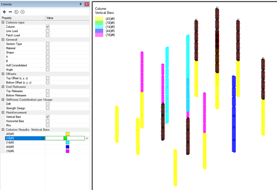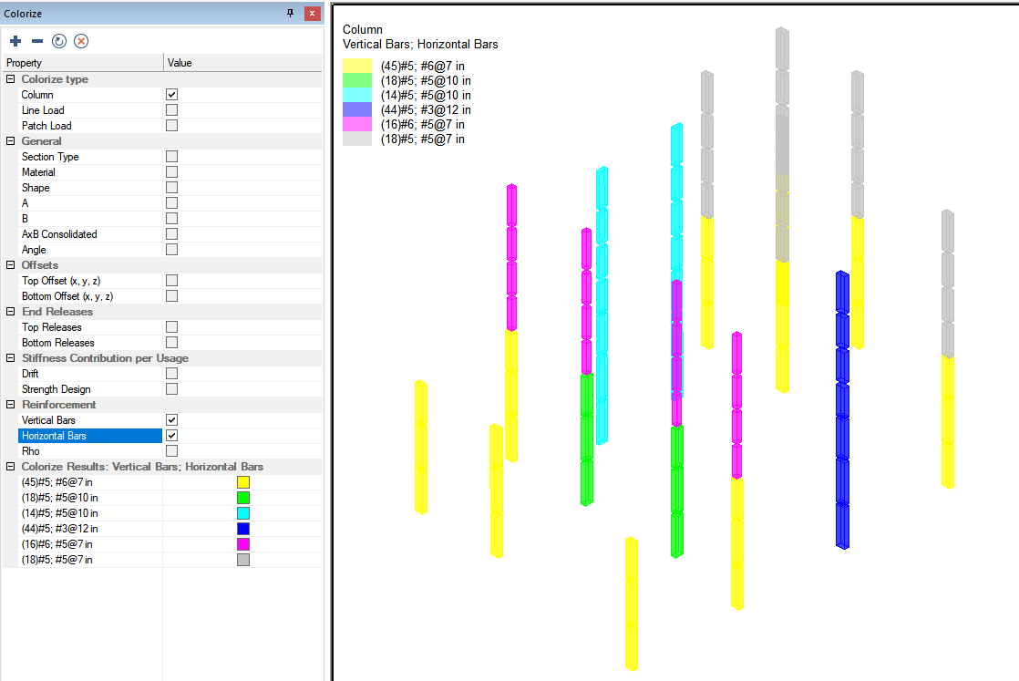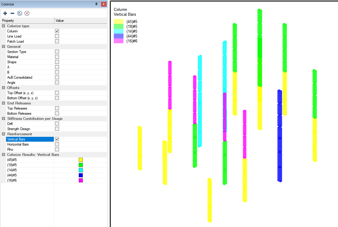 Check the box next to Vertical Bars in the Reinforcement section of the colorize panel. The program will then colorize columns based on the vertical bar size assigned to the column. A legend will appear in the upper left of the model space denoting the bar size used for each color.