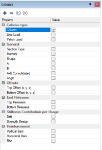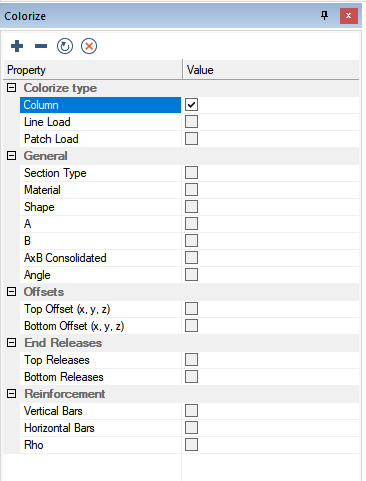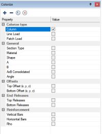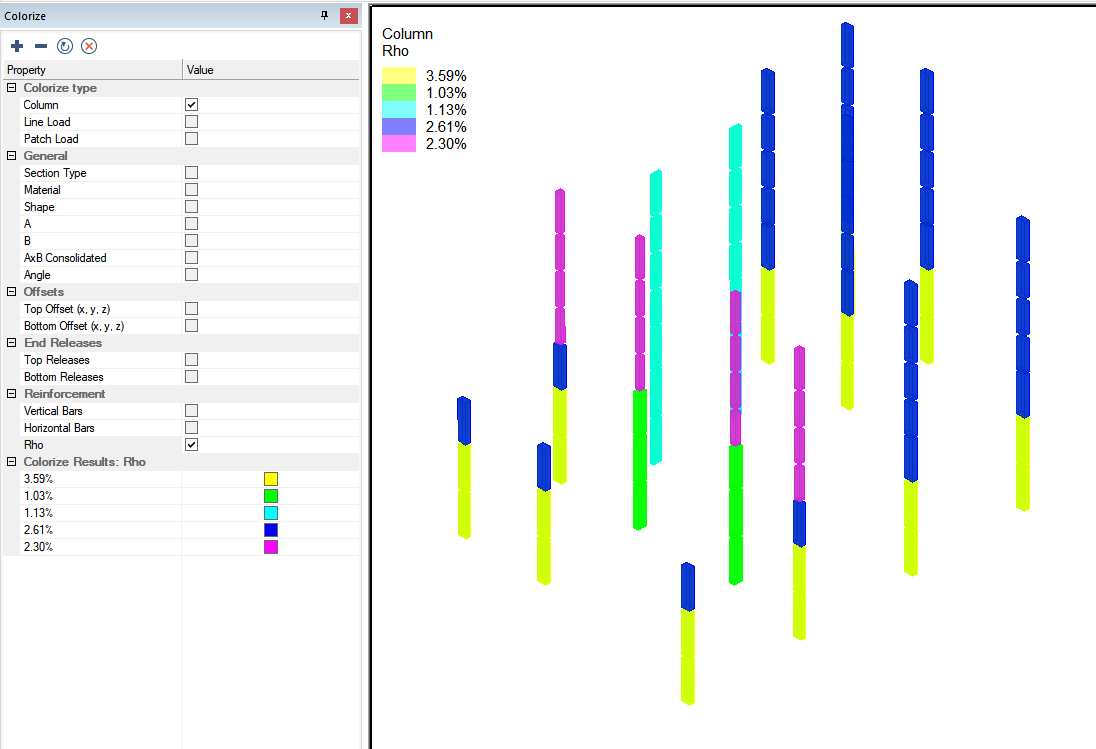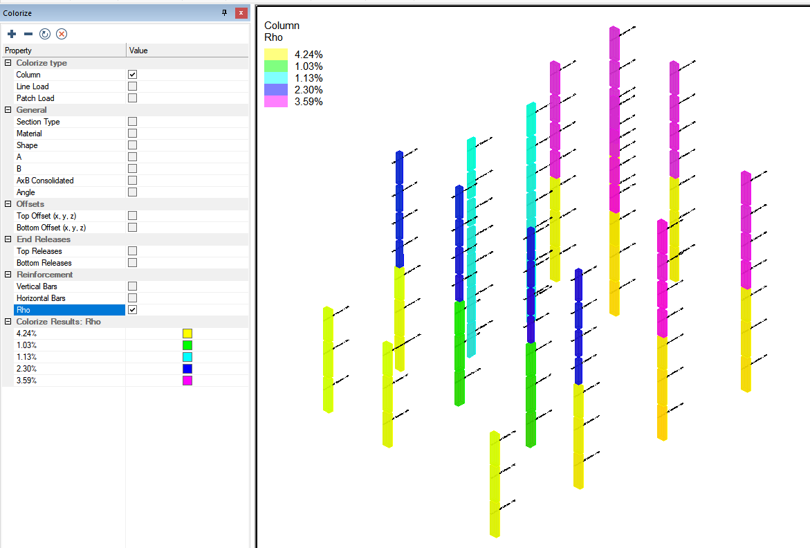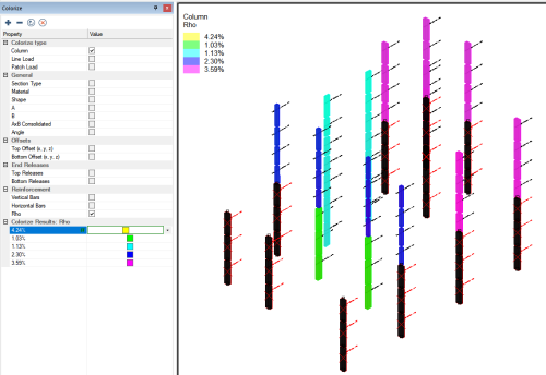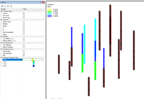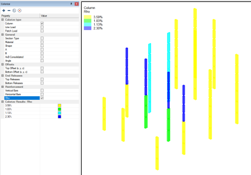 Within ADAPT-Builder the user can colorize columns based on a plethora of criteria. In the column design workflow, the colorize panel can be used to colorize the columns based on the vertical or horizontal reinforcement assigned to the column or based on the value of Rho for the column. Click the + sign below to expand instructions on to colorize columns based on the reinforcement assigned to the column.