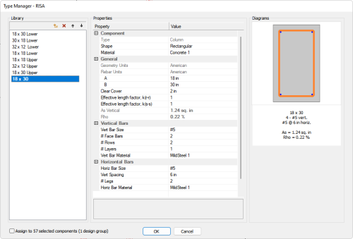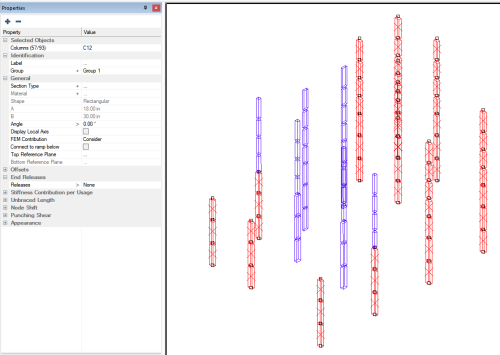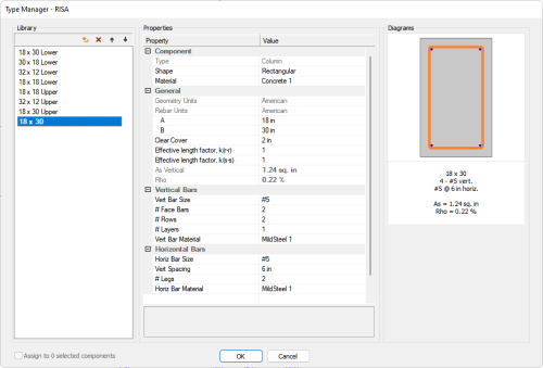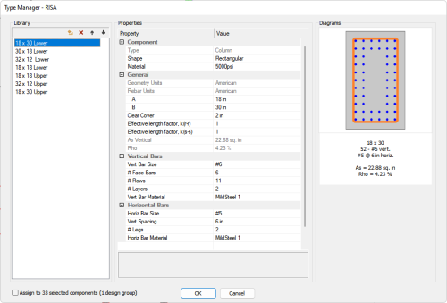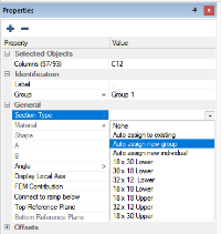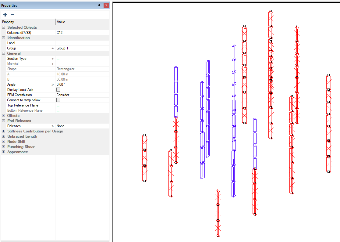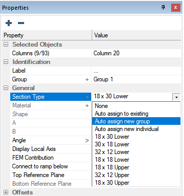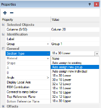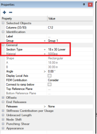 Click on the Properties tab to see if the selected columns are assigned to the same Section Type. We can see that the section type of the selected columns shows a name of 18 x 30 Lower. This indicates all the selected columns are assigned to the same section type. If the columns were not all assigned to the same section type you would see three dots for the Section Type property.