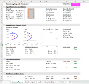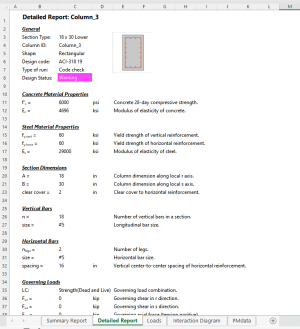 Clicking on the Detailed Report tab of the XLS file we can see more detailed column design results as shown below.