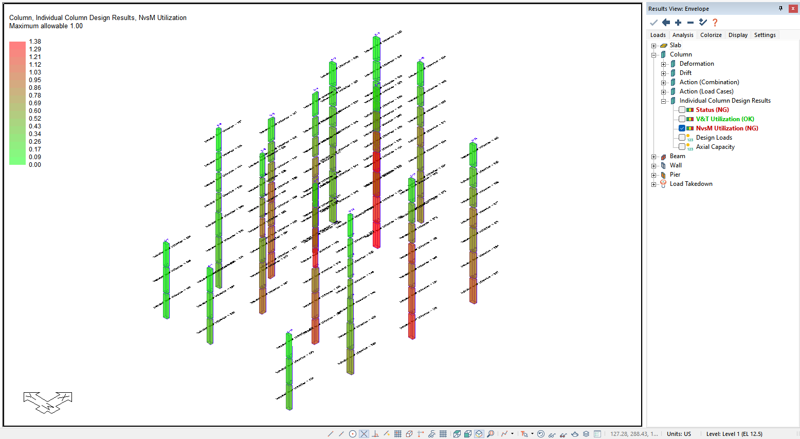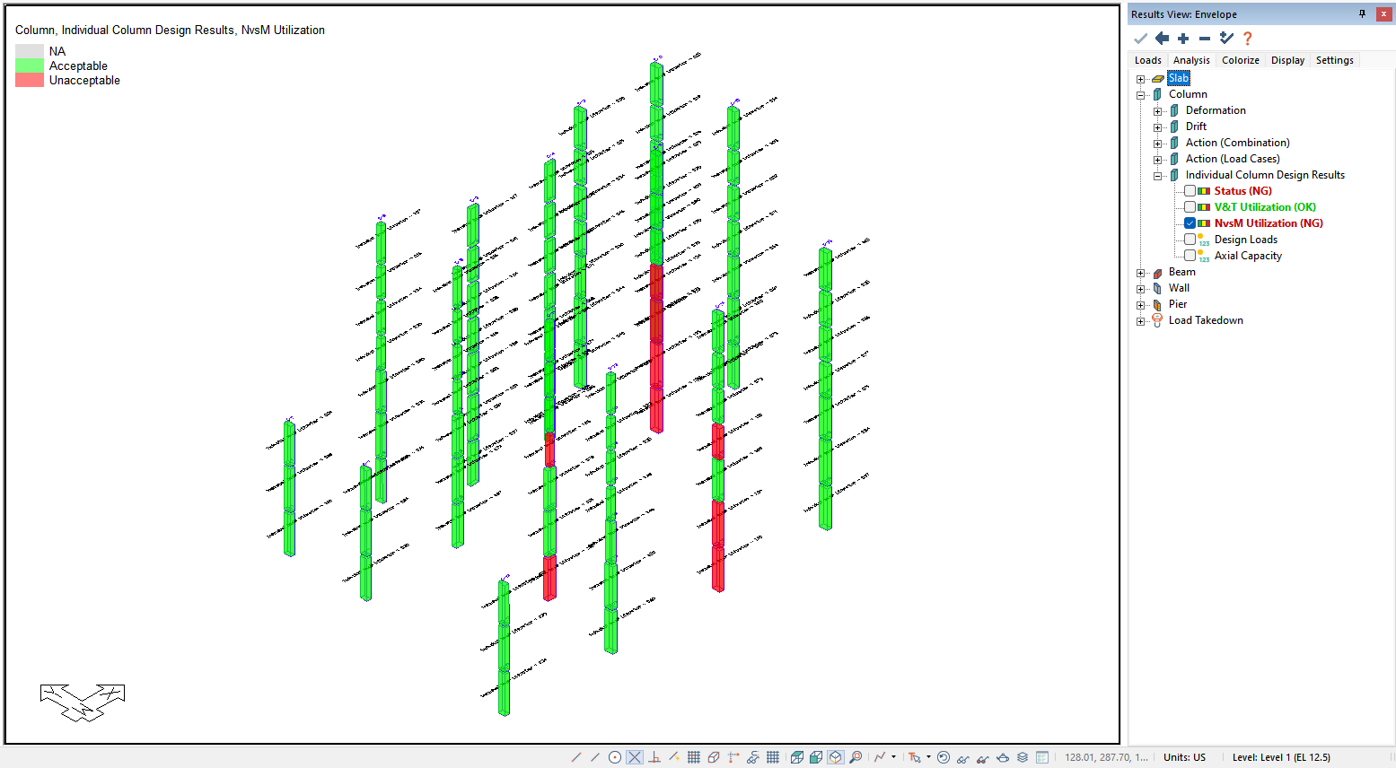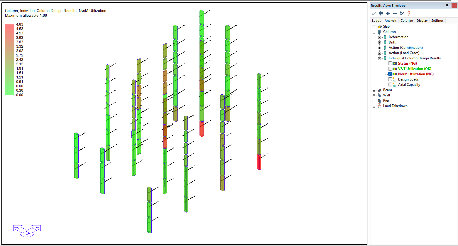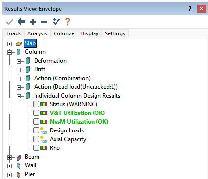 After the user has executed a column code check the user can view the graphical results through the Results View panel. The applicable results to a column code check are found in the Column>Individual Column Design Results tree as shown below. The user can check the overall column status, the V&T Utilization, NvsM Utilization, Design Loads, and/or Axial Capacity result.