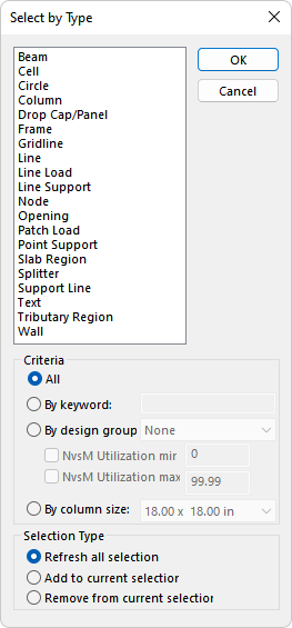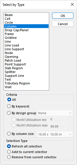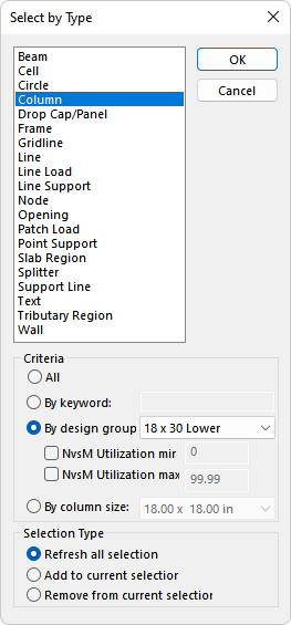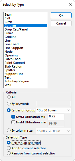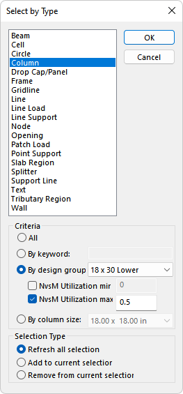 Select the checkbox for NvsM Utilization max and edit the value to equal to 0.5. This will select all columns within the 18x30 Lower section type which has a N vs M utilization less than 0.5.