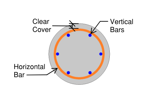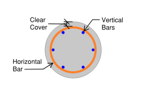 For circular columns, the layout of the bars includes horizontal (shear) reinforcement defined by its diameter and spacing between horizontal bars along the length of the column. The distance from the face of column to the CG of the horizontal bars is the clear cover + 1/2 the horizontal bar diameter. Vertical (bending) reinforcement is defined by the number of bars and bar size. Vertical bars are spaced equally. The distance from the face of column to the CG of the vertical bars is the clear cover + the horizontal bar diameter + 1/2 the vertical bar diameter. The user can define column reinforcement through the use of Section Types.