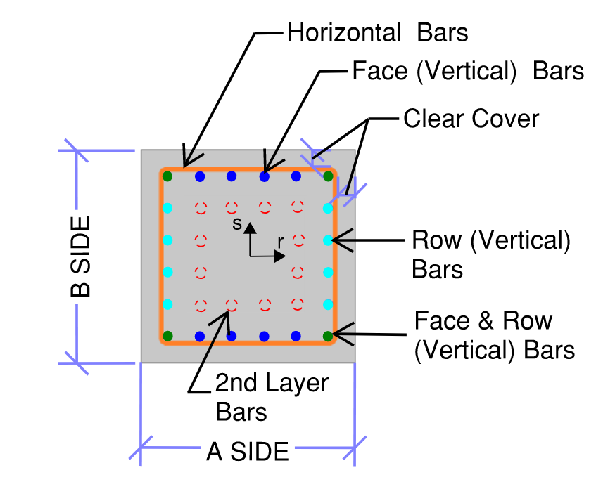 The below figure is a column with the number of Face bars set to 5 and the number of Row bars set to 4. The dashed purple bars represent a 2nd layer of Face and Row bars if the user has chosen two layers. The user can define column reinforcement through the use of Section Types.
