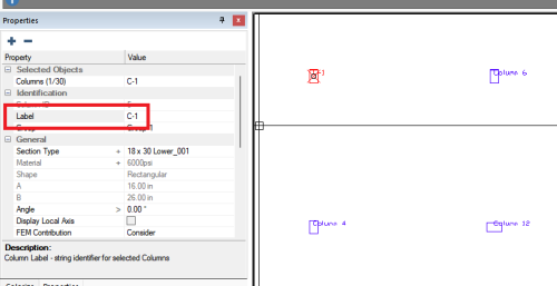 Select a column or wall and modify its label in the Identification section of the Properties Grid. In this example, we have modified the label of the upper left column from Column 5 to C-1.