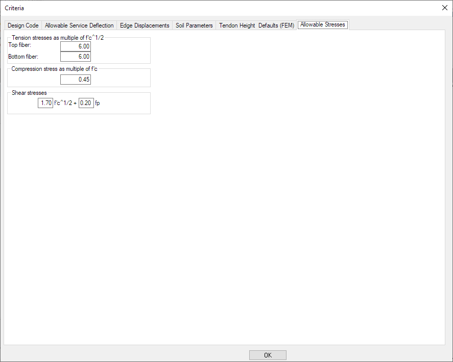 The program default allowable value for calculated tensile stress are: US Units: ft = 6*√f'c SI Units: ft = 0.5*√f'c MKS Units: ft = 1.62*√f'c |