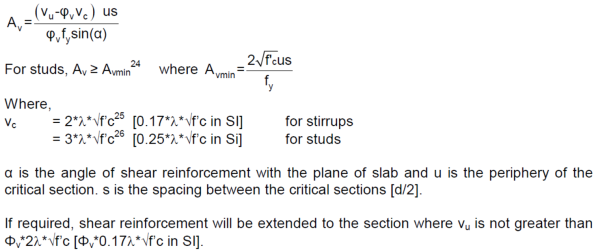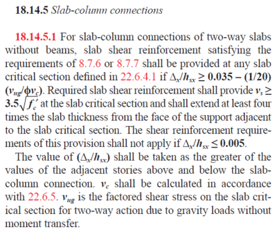 The current expressions used to calculate As for two-way shear are shown below as taken from ADAPT-Technical Note TN504 . If the Apply minimum reinforcement for drift requirement is selected, the program checks this requirement only if reinforcement is required at that critical section. The program checks that the quantity in the parentheses is ≥ 3.5*√f’c for all critical sections within a distance of 4*slab thickness from the face of support.