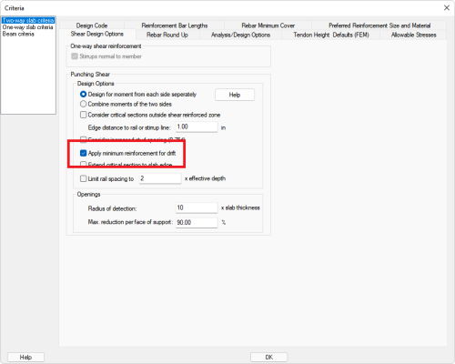 The option to apply two-way shear minimum reinforcement code provisions for seismic drift as found in ACI 318-14 Section 18.14.5.1 is given in the Criteria ribbon Shear Design options window.