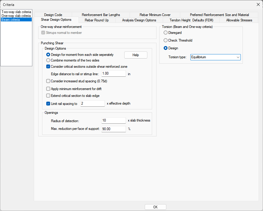 Lets you chose the options for performing torsion design of beams within your model. Only available when ACI-2019 or ACI-2022 is the selected design code.