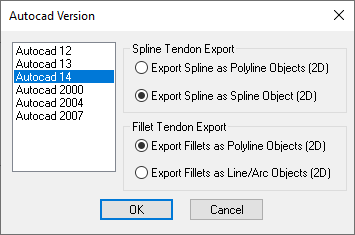 A window opens for selecting the CAD version and tendon type (linear or spline) for export of the current view, as a .DWG or .DFX file.