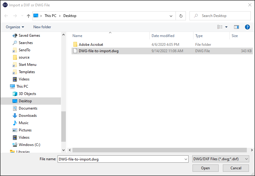 An Import a DXF or DWG File window opens.