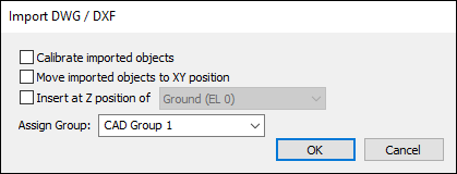 Allows you to group the imported CAD line work to a specific group. This option is especially useful for multi-level modeling where the floors all have different outlines, as you can assign each imported level to a different group. For example, you can assign the first imported group to Level 1, the second to Level 2, and so on. You can either choose an existing group from the drop-down list or type in a new group name in the Assign Group box. These groups can then be displayed (on/off), purged, or deleted, using the Group Library icon From Visibility > Display Settings. |
