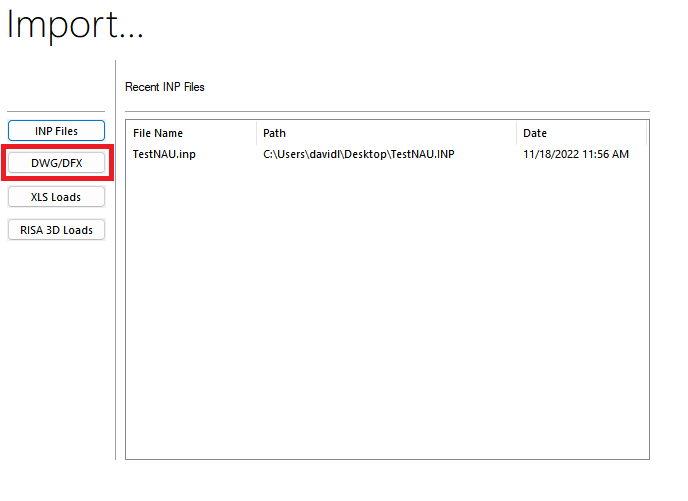 The Import a DWG/DFX File feature allows you to import DWG/DXF files into the model which you can then use the tools of the program to generate a 3D structural model from. This is the same functionality that can be accessed from the Model tab by choosing Gridline Wizard > Import Gridlines from DWG.