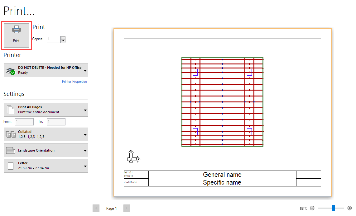 During any point in your model setup or analysis, you can print the displayed view of the model to a printer or PDF file.