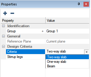 In the property grid, choose the design criteria (two-way, one-way, and beam) that you want used for the section.