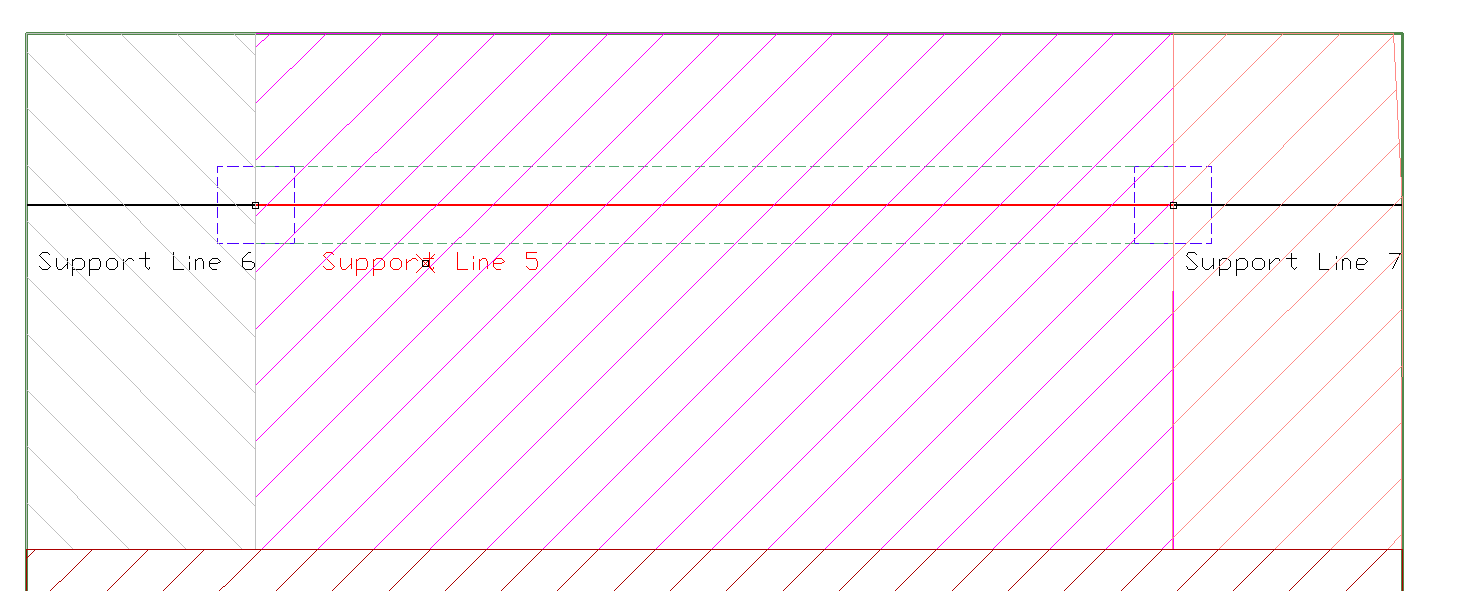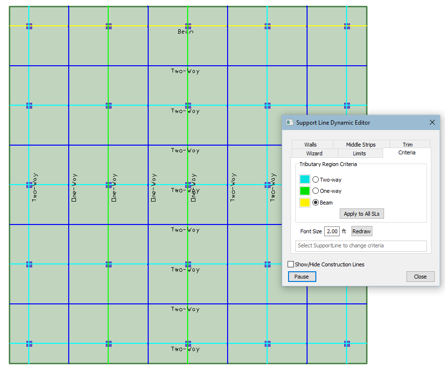 The Font Size options allows you to set the font size for the text showing the tributary region limit setting. The image below shows an example of a mixed set of support lines with different Criteria settings. Note that the colorized indication is only active while in the Dynamic Support Line Editor. Example: Mixed support lines with different limits Click on image to enlarge it |