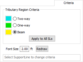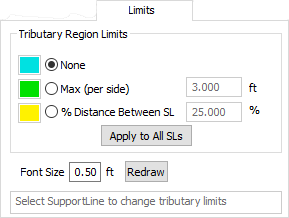 Tributary Region Limits allows you to change the selected support line design criteria and tributary limits for the design strip. There are three options from which you can choose: