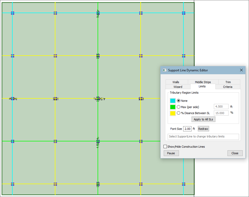 The (Tributary Region) Limits tab allows you to change the selected support line design criteria and tributary limits for the design strip. When this tab is selected, the current design criteria and limits are displayed on all support lines. Set the desired criteria and snap or window support lines to modify to the desired setting.