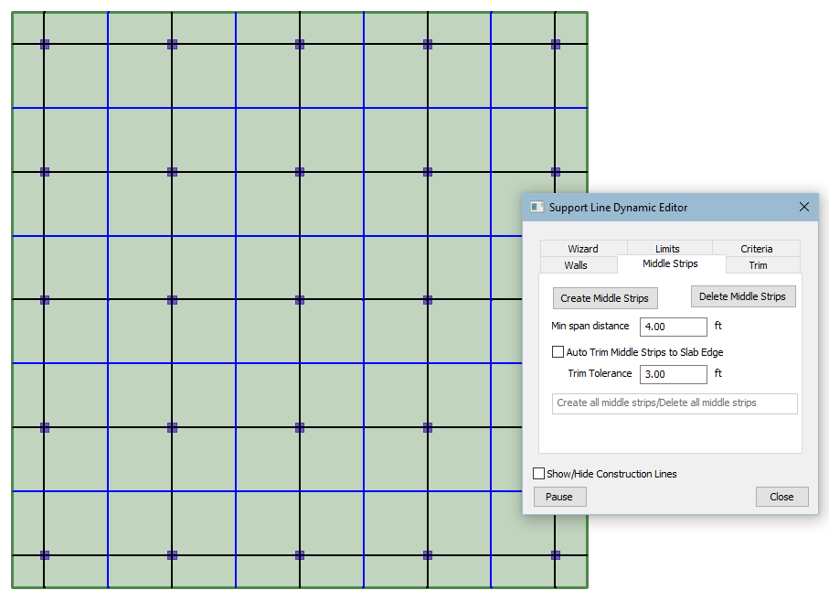 When the Create Middle Strips button is clicked, the program automatically generates middle strip support lines between already-defined column strip support lines. These lines are colored in blue, while active in the Support Line Dynamic Editor. Click on image to enlarge it |